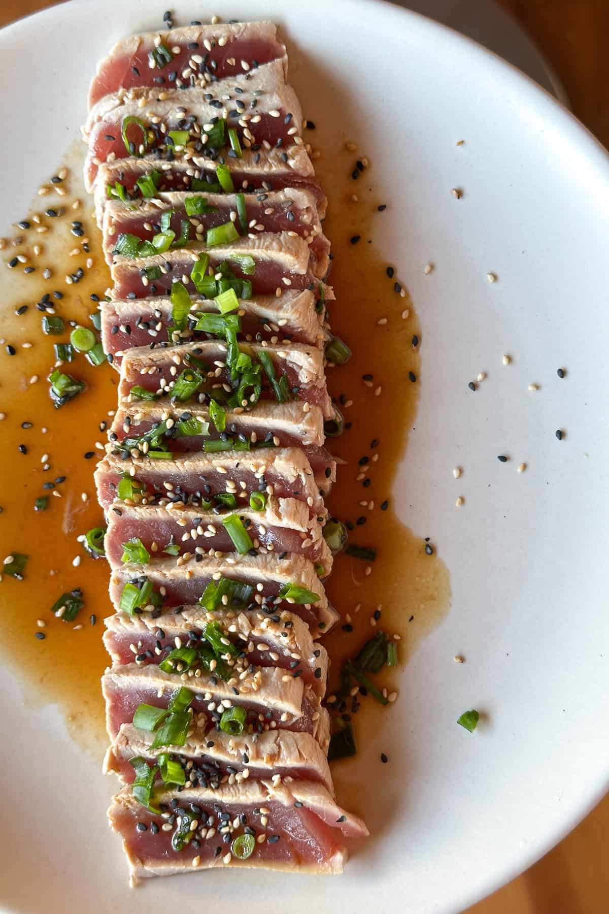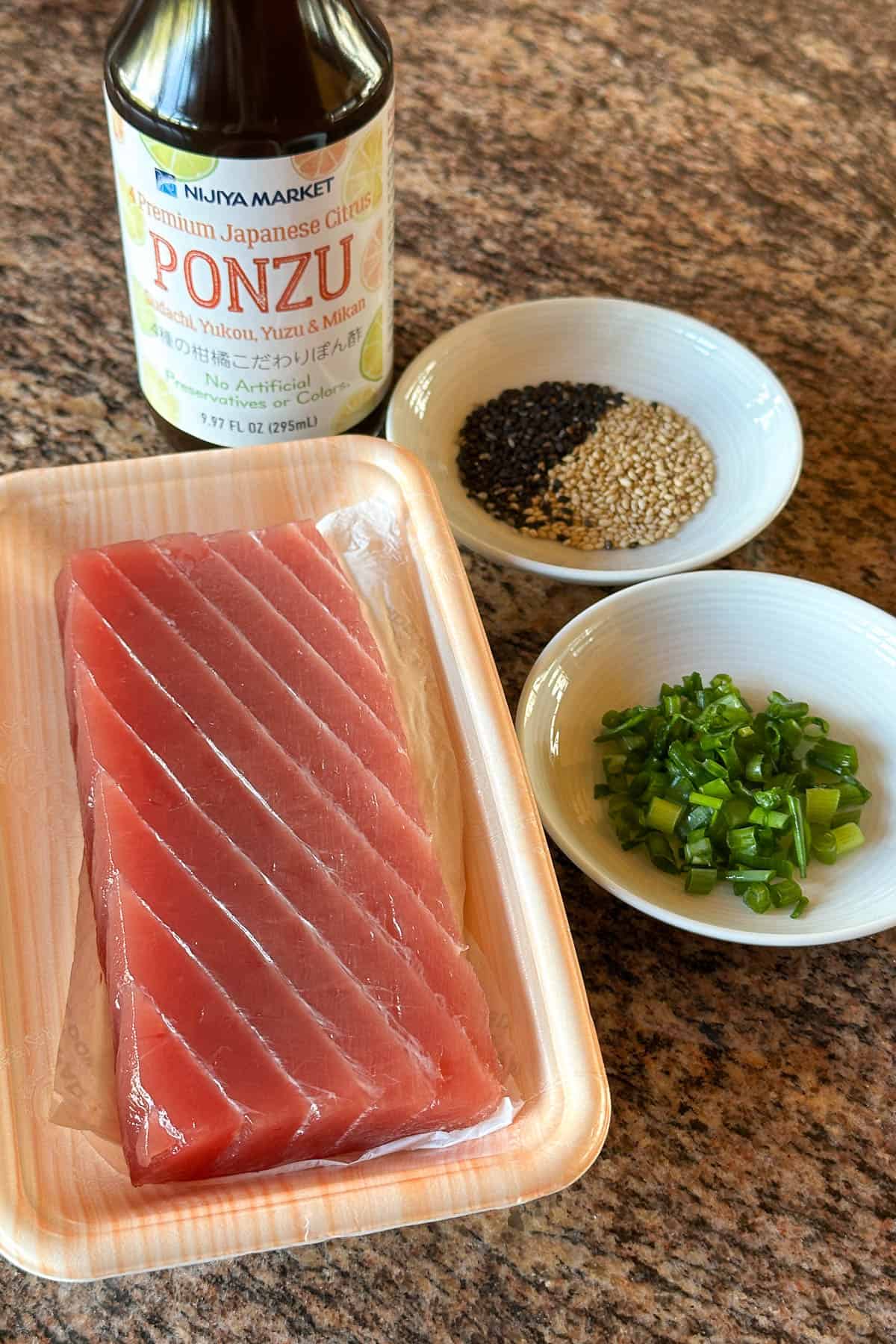 - Arrange the slice ahi on a plate, with the pieces slightly overlapping. Drizzle the ponzu sauce over the ahi. Top with chopped green onions and the roasted sesame seeds. Eat and enjoy ^_^